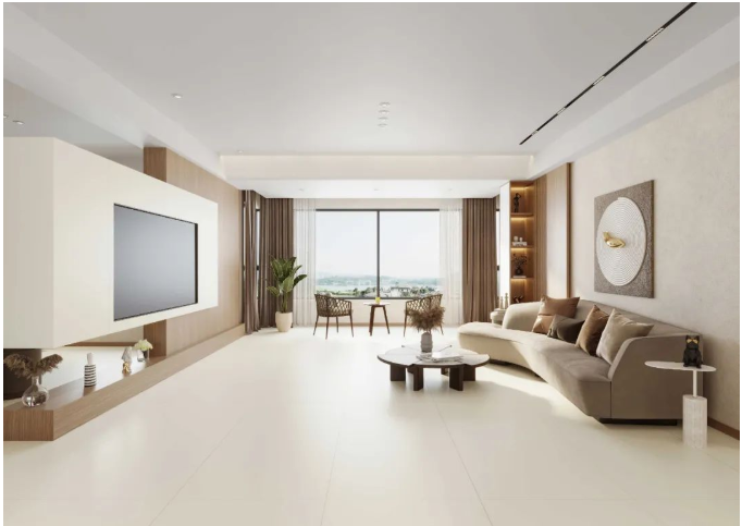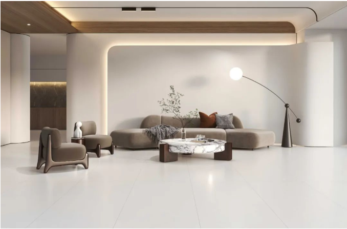 有著天然紋理的宋素|凡古磚,搭配質感柔軟的絨布沙發,將視覺的飽和度降至最低,形成一種舒適的視覺效果。