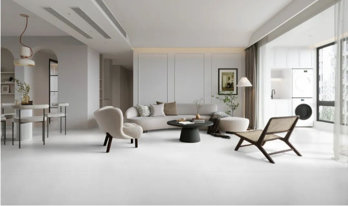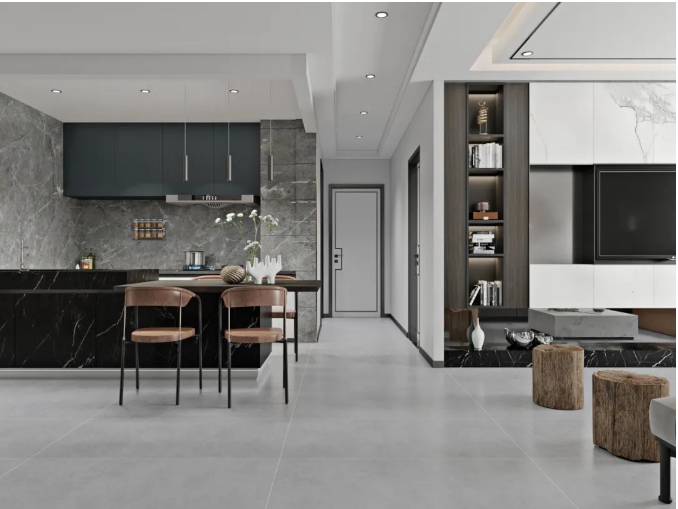 客餐一體化,大規格通鋪設計,能讓兩個功能區連貫起來,讓空間格局流動性更好,視野瞬間擴大。