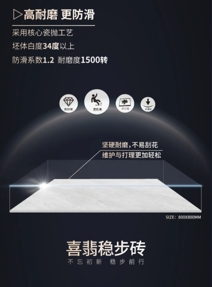 帝臣瓷磚2023年春季新品—喜翡穩步磚,采用核心瓷拋工藝,耐磨防滑技術再突破,親膚防滑設計輕松應對各種空間需求,美觀又安全!